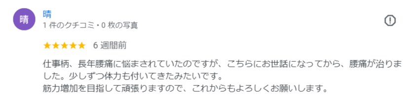 肩こり・腰痛がひどく7年ほど整骨院に通っていましたが、根本から改善したくこちらに通い始めました。通いはじめてまだ4ヶ月程ですがあれほど悩んでいた腰痛はなくなり、猫背もかなり改善して肩こりも楽になり趣味のゴルフも思い切り楽しめています。